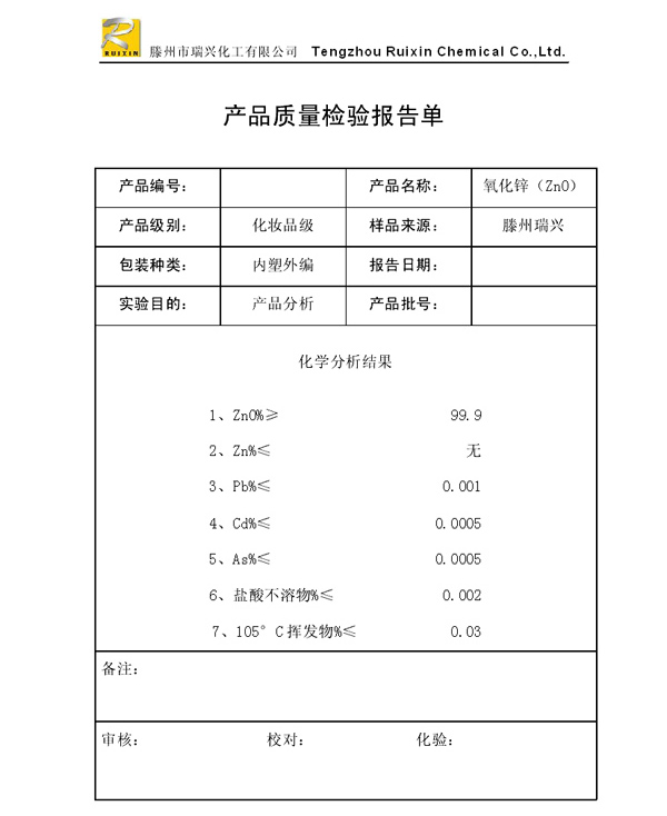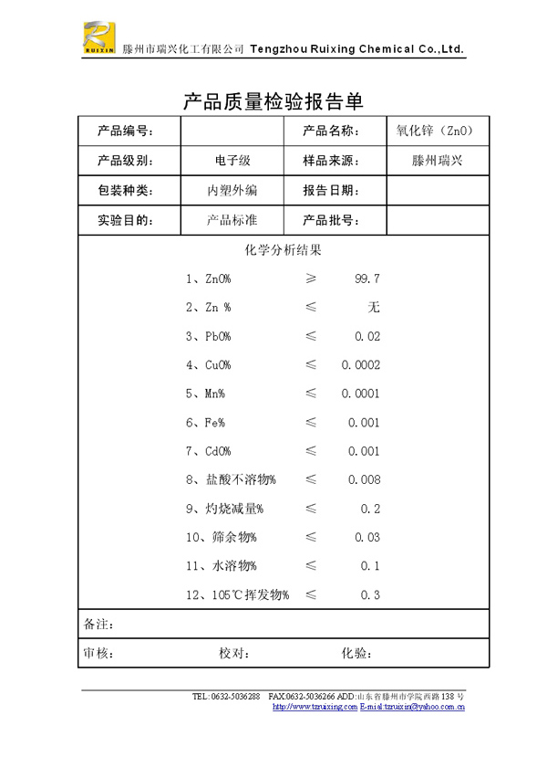 瑞興化工有限公司是生產(chǎn)氧化鋅的重點企業(yè),于2008年通過ISO9001:2008質(zhì)量管理體系認(rèn)證?!叭鹋d”牌氧化鋅在國內(nèi)擁有較大穩(wěn)定的市場,并遠銷東南亞、中東、中南美等國家和地區(qū),在國內(nèi)外享有較高聲譽。